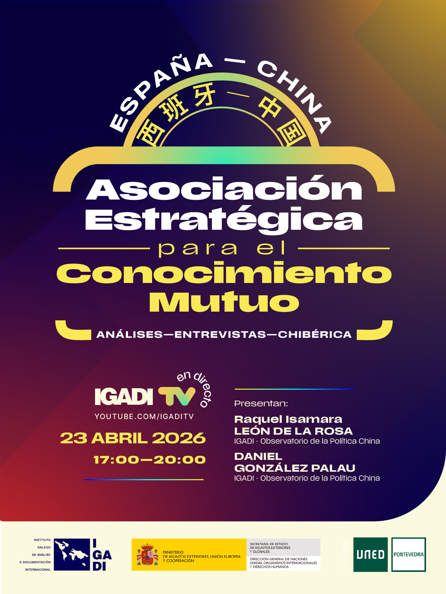 O pasado xoves 23 de Abril, entre as 17h e as 20h, celebrouse o programa de tv por internet “España-China: Asociación estratéxica para o coñecemento mutuo”. Podes revivilo desde aquí.